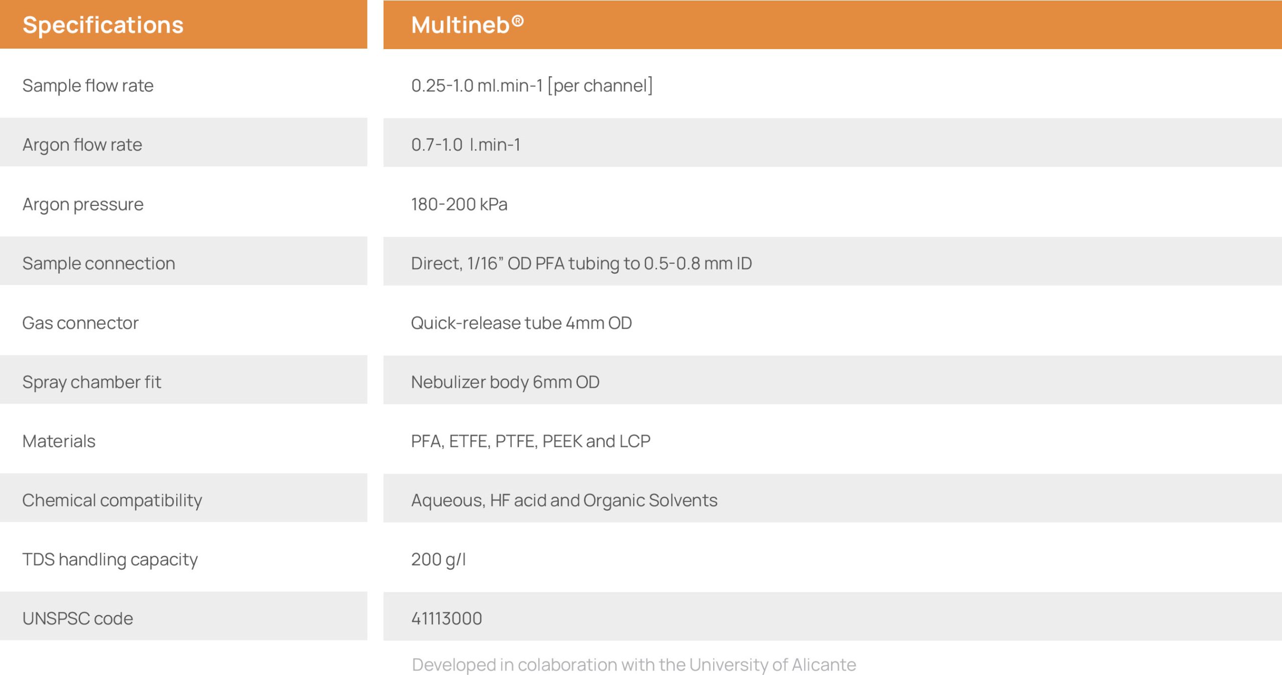 MultiNeb nebulizer, sample connector 1/16” with PFA tubing, quick release gas connector 4 mm, 4mm black rigid gas tube with clamp, two conical sample line adapter (4 parts/ea) for peristaltic pump 1/16” tubing to 0.5-0.8mm